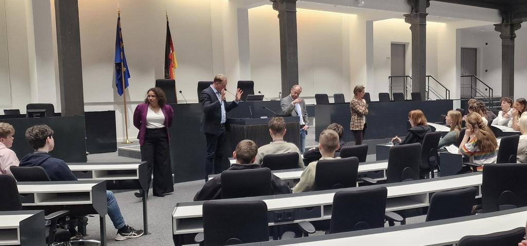 Im Anschluss an die Sitzung nahmen sich die Landtagsabgeordneten Saskia Buschmann, Wiard Siebels, Lena Nzume und Stefan Marzischewski-Drewes Zeit für ein persönliches Gespräch mit den Klassen. In einer offenen Fragerunde ging es unter anderem um den Alltag von Politikerinnen und aktuelle politische Themen. Die Schülerinnen und Schüler nutzten die Gelegenheit, ihre Fragen direkt an die Abgeordneten zu stellen und erhielten spannende Einblicke in die Arbeit im Landtag.