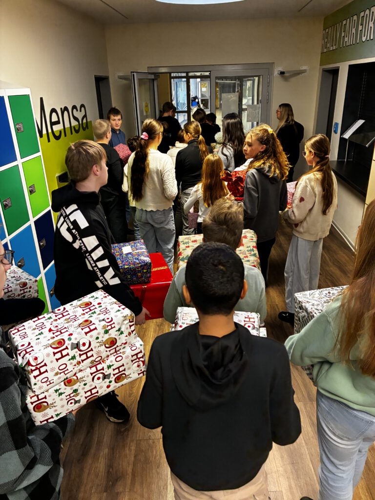 Geleitet wurde die Aktion an unserer Schule von Frau Hinrichs. Besonders erfreulich war, dass sich zahlreiche Religionskurse aktiv beteiligten: Viele Schülerinnen und Schüler packten im Unterricht oder in Projekteinheiten gemeinsam Pakete, suchten passende Geschenke aus und bereiteten die Kartons liebevoll vor.