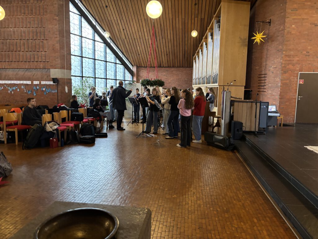 Für die passende musikalische Begleitung sorgten Herr Wagener und die Bläserklasse 7a. Gemeinsam mit allen Anwesenden wurde gesungen, was für eine besonders schöne und festliche Stimmung in der Kirche sorgte.
